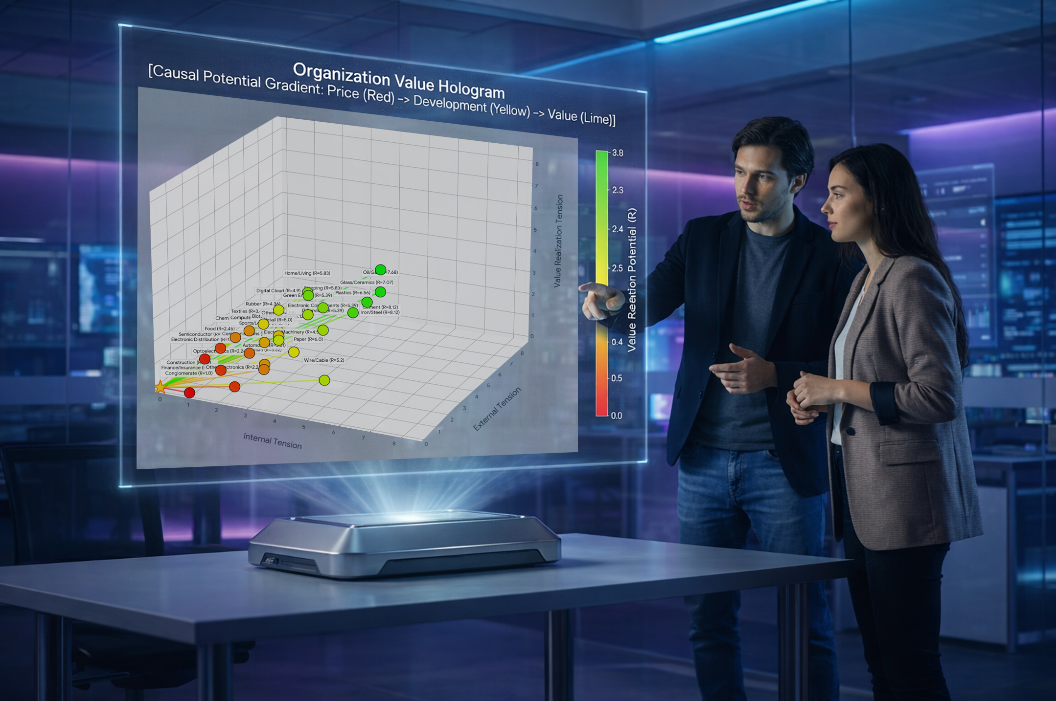 - Z 軸|價值實現張力 (Value Realization Tension):這是內外部張力交織後,投射在價值顯化上的最終難度。