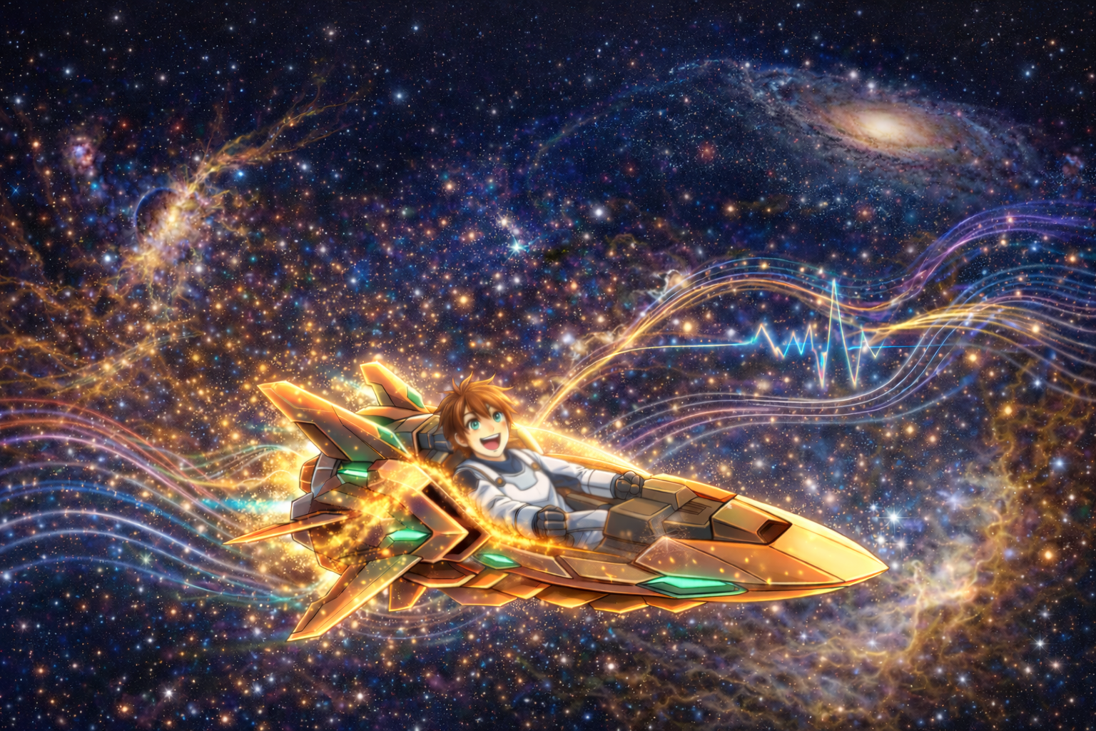 聽著音樂,不知不覺,你的意識感應到宇宙的另一端,你成為了另外一個你,你是同時間駕駛著同一台太空船型號出發的太空人。當你觀察遠方的父母星系,你會發現生命誕生的物理真相。原來,生命透過共鳴,不斷在無形的場中「創造」出新的能量與質量。這種「創造」本質上是從真空背景(Zero-point energy)或高維頻譜中「提取」並「組織化」,而非違反熱力學第一定律的憑空產生。這是一個從「波的干涉」到「質量凝結」的壯麗過程。