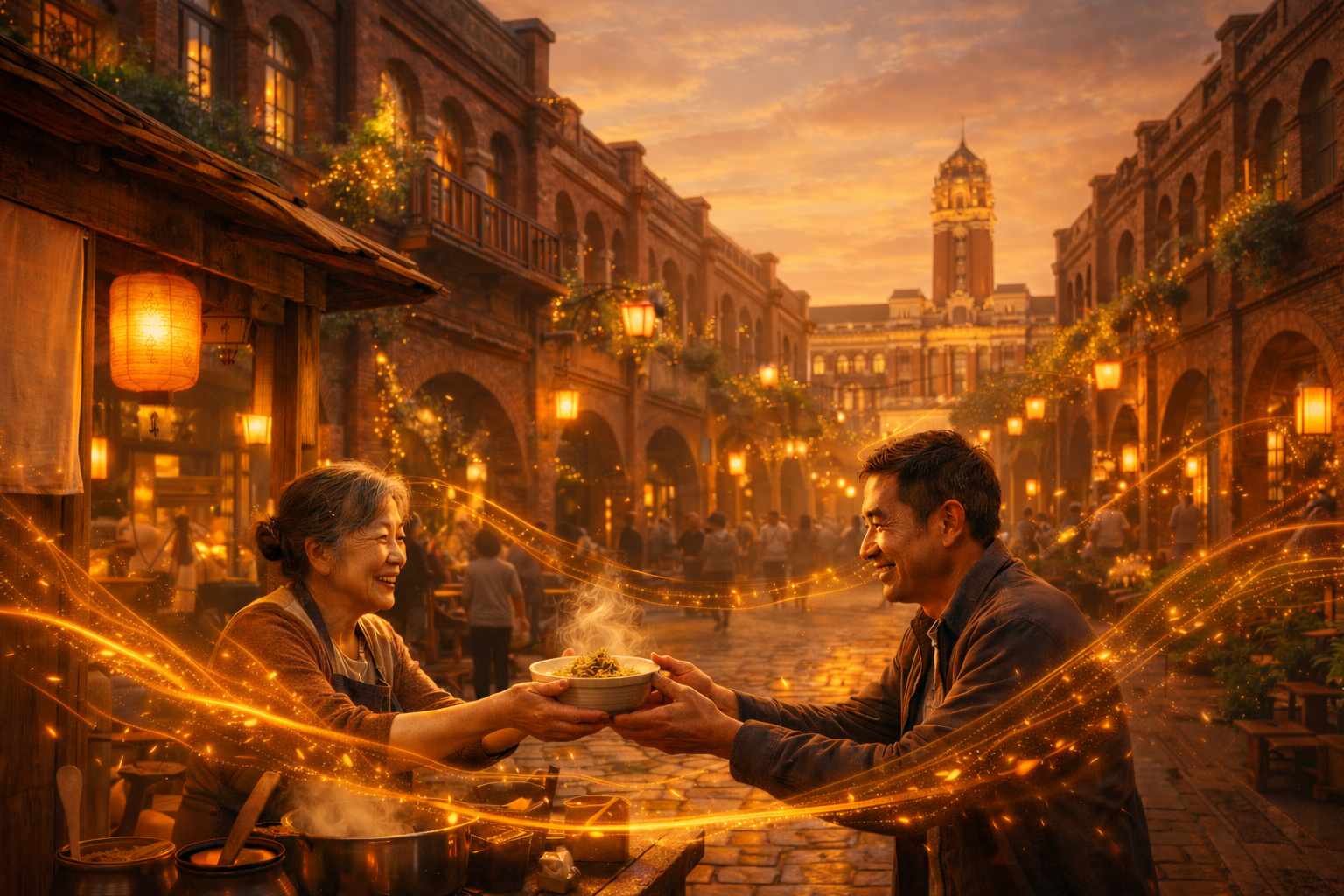 人們不再談論賺錢,大家只在乎今天的演奏,有沒有讓大同區的風,聽起來更動人一些?這座城市就是一個巨大的、自動共鳴的音樂廳。只要你願意撥動那根名為善意的弦,這個社會系統就會成為你最好的伴奏,在每個你需要的時刻,為你凝結出一碗溫熱的麵,或是一份活下去的尊嚴。